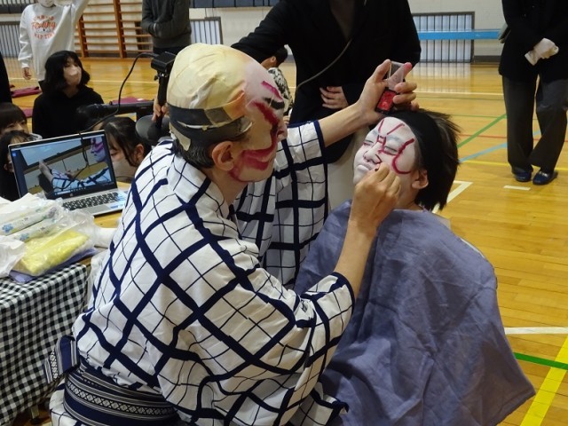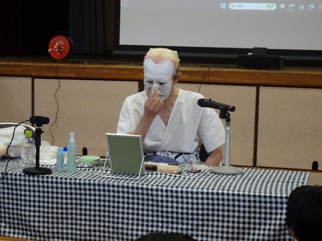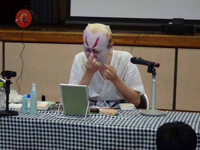 見得の切り方や歌舞伎独特の隈取という化粧の方法を実演して見せていただきました。代表の児童が所作を習ったり実際に隈取をしていただいたりしました。日本の文化に生で触れることができました。