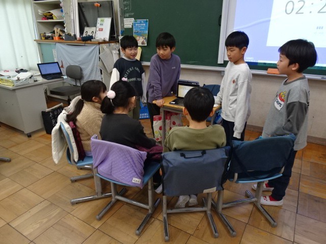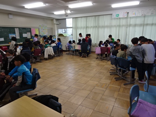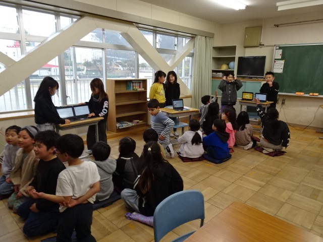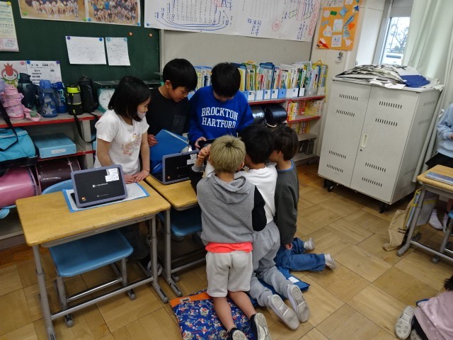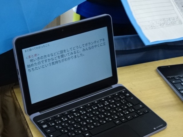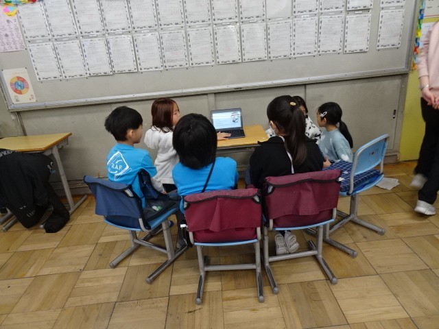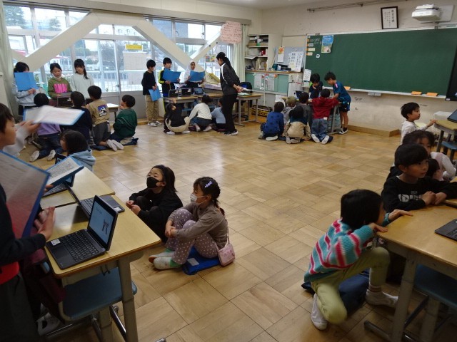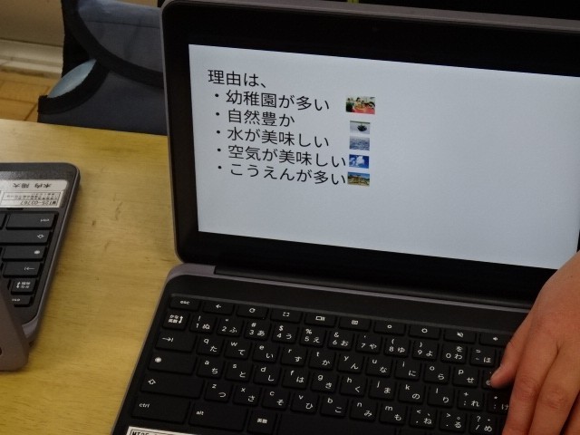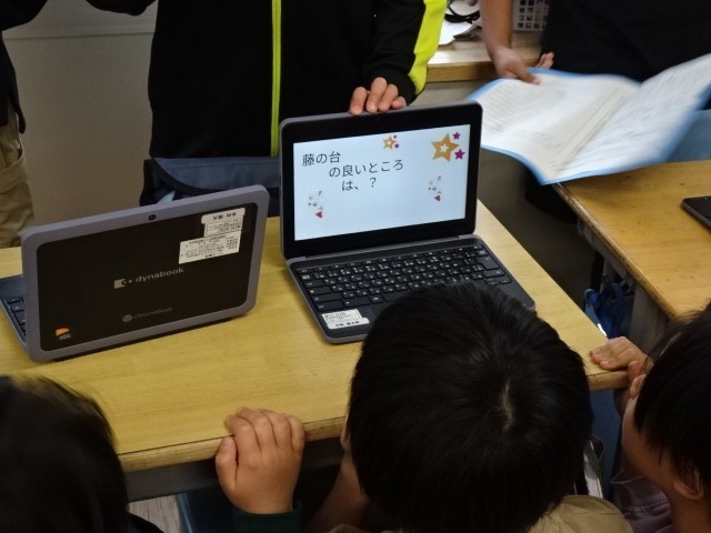 3年生になって初めて取り組んだ総合的な学習では、地域の方々にたくさんお会いしました。登校を見守ってくださる見守りボランティアの方々、近くのラララキッチンの方、藤の台団地に住む方々。その方々の思いを受け感じたことや考えたことをスライドにまとめました。藤の台のよいところをまとめて話している子供たちもいました。2年生が楽しめるようにクイズやアニメーション、写真も工夫していました。