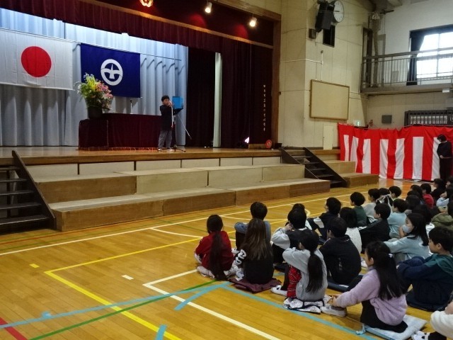 令和7年度の修了式がありました。1年1組から5年2組や藤級の代表児童が修了証をいただきました。校長先生のお話では、あゆみの所見にあった子供たちの頑張った様子が紹介されました。そのあとは2年生と5年生の児童代表の言葉がありました。聞いている子供たちの集中した姿が立派でした。