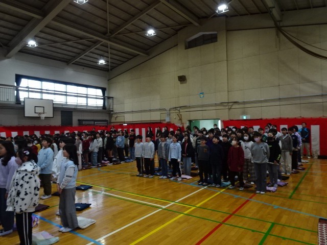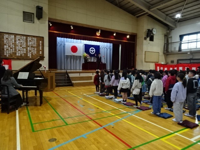 式の終わりに校歌を歌いました。子供たちの、のびのびとした歌声が体育館中に響きました。