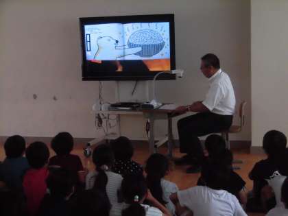 3年生の読み聞かせしました。「おぼうさんとたこきち」というお話と「おいしそうなしろくま」というお話を読みました。いつも本をもちながら読んでいたのですが、今回は人数も多いので、実物投影機を使って、モニターに映して読みました。読むことに集中できるので、効果抜群でした。子どもたちも静かにお話を聞いてくれて、嬉しかったです。本校の子どもたちは本当に素直なお子さん達が多いです。めんどくさがったり文句を言う子がいないです。素晴らしいです。次はどんな本を読もうかなと楽しみになりました。