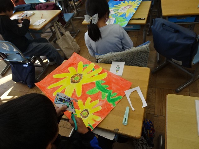 2年生が『ひまわりと小人たち』の絵を作っていました。ひまわりの茎や花で遊んでいる...