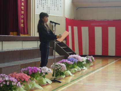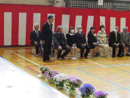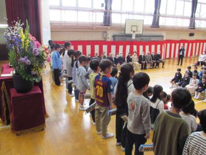 1年生の入学をお祝いして、来賓の皆様からひと言ずつお祝いのお言葉をいただきました。在校生からは、2年生が合唱と合奏で1年生を歓迎しました。6年生代表の言葉では、頼りになる6年生が、1年生に向けて立派なメッセージを伝えてくれました。
