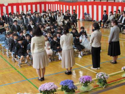 いよいよ1年生の担任の先生の発表です。子どもたちはドキドキしながら、先生方のあいさつを聞いていました。他にも1年生に関わる、たくさんの先生方を紹介しました。