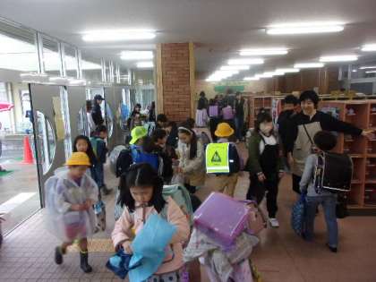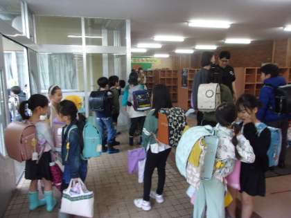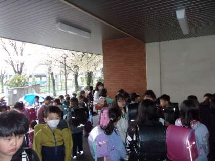 今日は朝からあいにくの雨です。ほとんどの学年で、今日から各教室での授業が始まるわけですが、雨の中、子どもたちは傘をさし、手にはたくさんの荷物を持って学校にやって来ました。登校時間も変わり、昇降口ではたくさんの子どもたちが並んで待っていましたが、大きな混乱もなく、落ち着いて先生方の指示に従って入室することができていました。