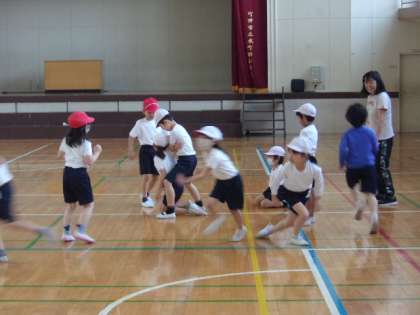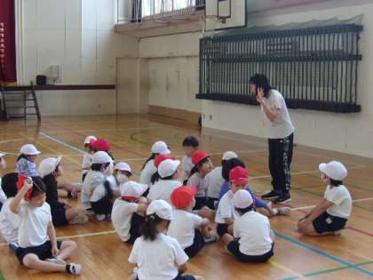2組の体育は、体育館で行われました。体ほぐしの運動遊びの課題を中心に、いろいろな動きを体験しながら、授業が進められていました。整列もしっかりできていて、とても立派でした。