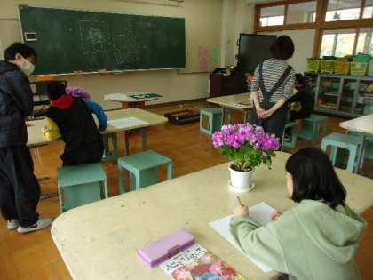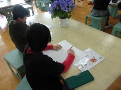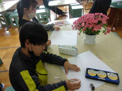 図工の授業も始まっています。みどり学級2組の5年生は、生活科室で静物画に挑戦です。いろいろな角度から花をじっくり観察して描きます。それぞれの個性があふれるすてきな作品に仕上げてくれるでしょう。完成が楽しみです。