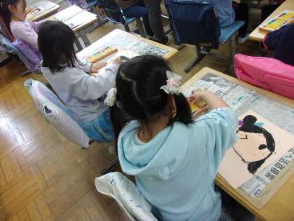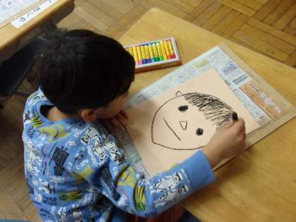1年生の図工の授業は、自分の似顔絵に挑戦です。鏡などは使わず、自分のイメージを大事にして描きます。きれいに色を塗って完成です。出来上がった作品は、教室に掲示する予定です。