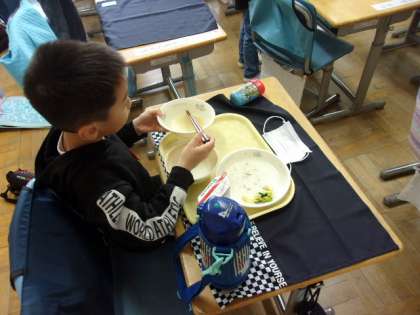 体育でしっかり体を動かした1年生は、給食がおいしいです。片付けもしっかりできて、立派でした。