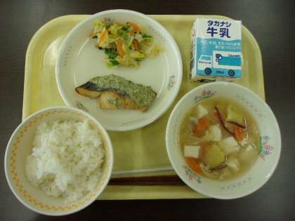 牛乳/ごはん/白身魚の磯マヨネーズ焼き/スタミナキャベツ/さつま汁