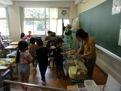 体育でしっかり体を動かした1年生は、給食がおいしいです。片付けもしっかりできて、立派でした。