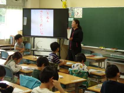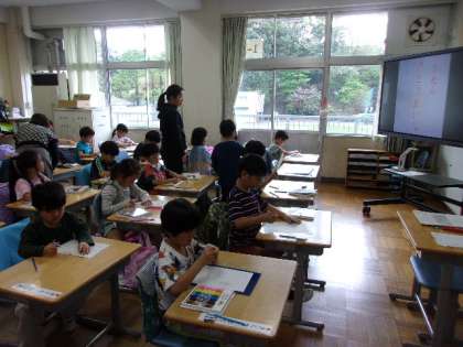 1年生の教室では、国語の授業で、自分の名前を平仮名で書く練習をしていました。先生のお手本を見ながら、短冊型の画用紙にていねいに書いていました。