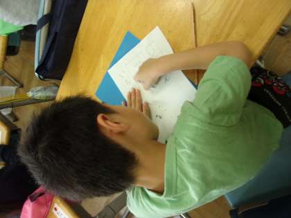 1年生の教室では、国語の授業で、自分の名前を平仮名で書く練習をしていました。先生のお手本を見ながら、短冊型の画用紙にていねいに書いていました。