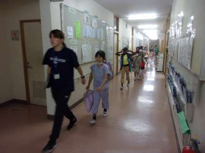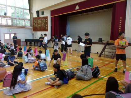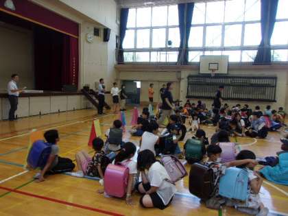 最後に残留児童の誘導をし、体育館で地区ごとに分かれて集合しました。先生たちも子どもたちも、最後まで緊張した表情で訓練に臨み、訓練を終えることができました。本日はご多用の中、訓練にご協力いただき、誠にありがとうございました。