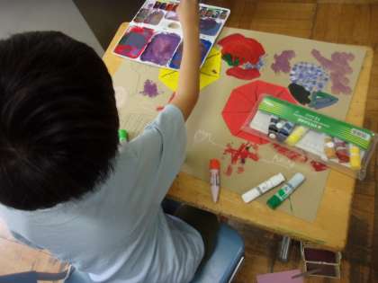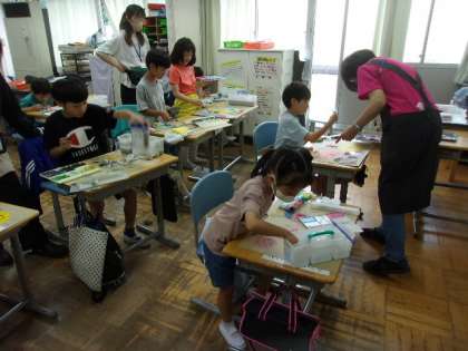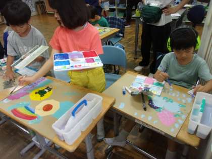 2組の1・2年生が、図工の授業で「紫陽花(あじさい)」を描いていました。学校の敷地内に咲いている花を摘んできて、じっくり観察しながら、それぞれの感性で表現します。色紙を使って花の部分を表現したり、絵の具の色をいろいろと混ぜ合わせて着色したりと、個性豊かな作品に仕上がっていました。