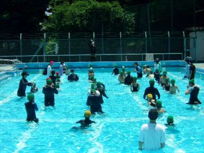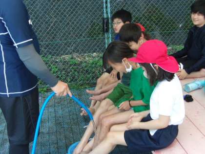 3・4時間目は、みどり学級で今年2回目の水泳指導です。絶好のプール日和の中、今日もしっかりプールの約束を守って、活動を楽しんでいました。休憩で水分補給をしたり、見学の子どもたちの足元に、プールの水をかけたりするなど、熱中症対策も行いながら、授業を進めました。