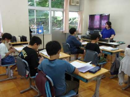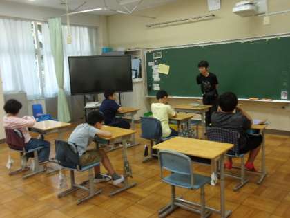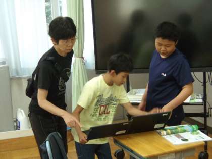 みどり1組の高学年の教室では、それぞれで課題に一生懸命な子どもたちの姿が見られました。6年生は音楽の授業で、リコーダーの練習に取り組んでいました。お隣りの5年生は、理科のメダカの育て方について、タブレットPCを使って調べていました。週末の午後にも関わらず、子どもたちは集中して課題に取り組んでいました。