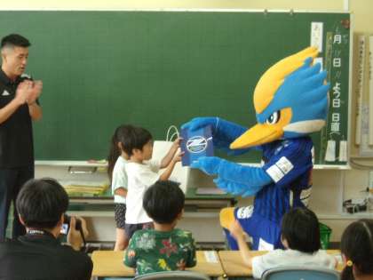 今日の朝、1年生の教室に、FC町田ゼルビアの人気キャラクター「ゼルビーくん」がやって来ました。1年生に下敷きのプレゼントを届けに来てくれたのです。突然の訪問に、子どもたちは大喜びです。