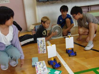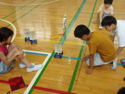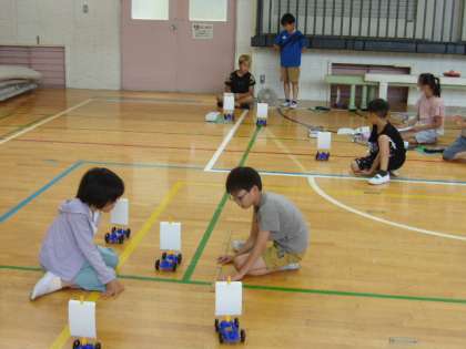 1組の理科の授業は、「風やゴムの力」の学習で、実験キットを使ってみんなで実験をしました。広い体育館で、今回はサーキュレーターを使って、実験キットの車を走らせます。グループで役割分担をして、風力を変えながら車の走行距離を記録するなど、楽しく活動していました。