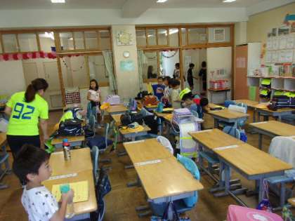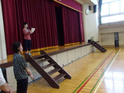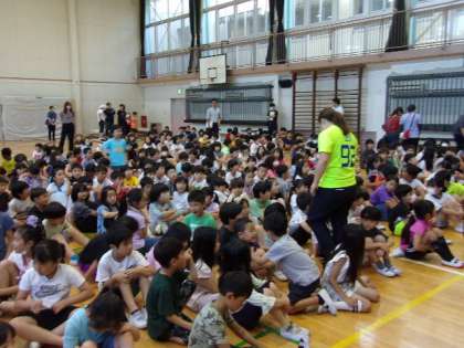 今日の朝の時間は、全校でのゲーム集会です。1年生も身支度を急いで済ませ、整列して体育館に移動します。集会委員の児童の司会・進行で始まります。