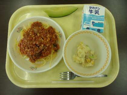 牛乳/なす入りミートソーススパゲッティ/枝豆とコーンのマッシュポテト/果物(メロン) 【食育の日】