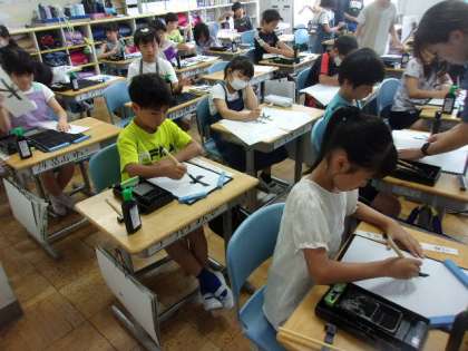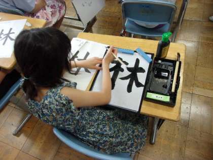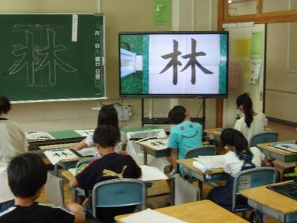 2組の書写の授業、今日の課題は「林」です。一文字ですが、トメ・ハライなどのポイントがあります。しっかりお手本を見ながら、気持ちを落ち着けて取り組みましょう。