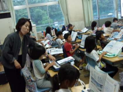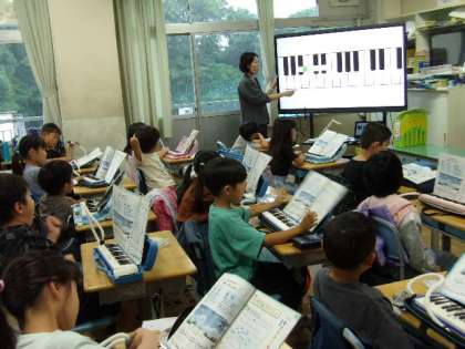 1組の3時間目は音楽の授業で、鍵盤ハーモニカを練習しました。最初は音を出さないで運指の練習から始めて、その後で実際に音を出して自分の音色を確かめます。先生が個別に回って見てくれるので、子どもたちは一生懸命練習に励んでいました。