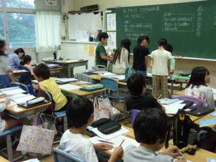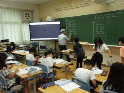 4年生の算数の授業は、2桁のわり算の問題です。計算の考え方を学んだ子どもたちは、問題演習で習熟を図ります。どの子も自信をもって先生のところに見せに行けてないようですが、しっかり復習してマスターしてくださいね。