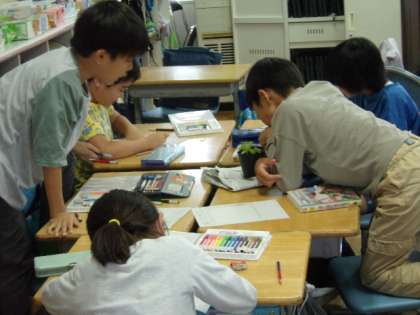 6時間目の1組は理科の授業で、ホウセンカの観察を行いました。グループで1つの鉢を机に置いて、それぞれが気付いたことを出し合いながら、観察カードにまとめていきます。どの子も葉や茎などの特徴をしっかりとらえて、カードにまとめていました。