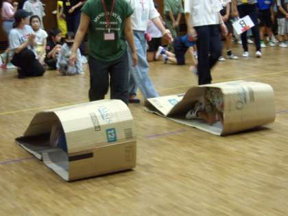 3校の子どもたちが混じってチームを作り、みんなで協力して、いろいろな競技を楽しみます。まずはダンスでジャンケンで、近くの友達と仲良くなります。キャタピラーリレーは、初めて挑戦する子も多く、みんなで声をかけ合って応援していました。