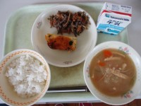 今日の給食は、「うめごはん」「小魚のいそべあげ」「大豆とひじきのサラダ」「カレ...