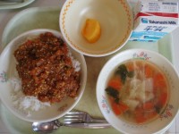今日の給食は、「ドライカレーライス」「かぶとポテトのスープ」「柿」です。「ドラ...