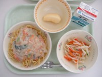 今日の給食は、「サーモンの豆乳クリームスパゲッティ」「シャキシャキポテトサラダ...