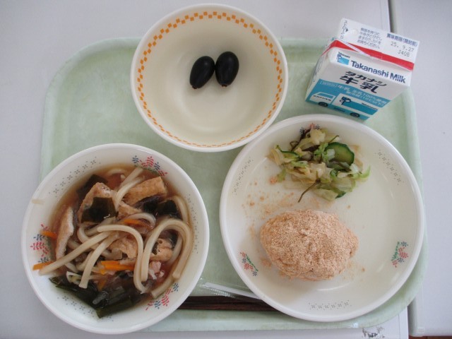 今日の給食は、「きつねいりわかめうどん」「ぶどう」秋のお彼岸にちなんで「おはぎ」です。