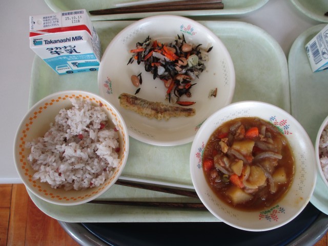 今日の給食は、「うめごはん」「小魚のいそべあげ」「大豆とひじきのサラダ」「カレー肉じゃが」です。