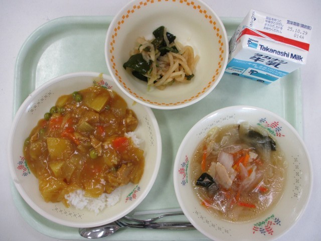 きょうの給食です! 公開日 2025/10/24 更新日 2025/10/24 校長室より きょうの給食は、「米粉のポークカレー」「ジュリエンヌスープ」「ワカメと大根のサラダ」です。 校長室より 全学年