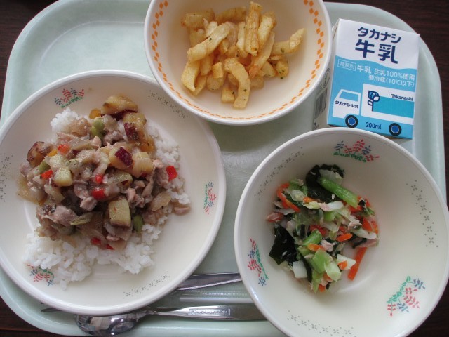今日の給食は、「コロコロ根菜のガパオライス」「じゃがあげカレー風味」「こまツナレモンサラダ」です。