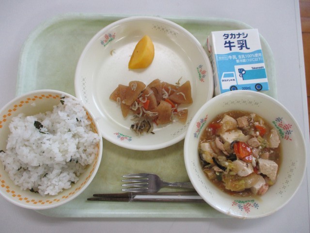 今日の給食は、「わかめご飯」「豆腐の五目炒め」「カルちゃん大根」「柿」です。