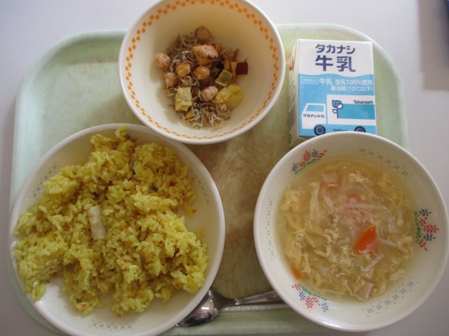今日の給食は、「シーフードピラフ」「さつまいもとひよこ豆のカリカリ揚げ」「洋風たまごスープ」です。