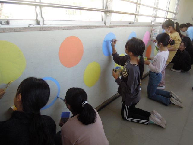 壁画プロジェクト第2弾です。校舎に「お別れ」を伝える「壁画(思い出)プロジェクト」の2回目です。今回は「お花」のベースとなる円に色を塗っていきます。壁用のアクリル絵の具を使って3年生以上が今週一週間で色を塗ります。3学期には第3弾として「お花」を描いていきます。完成が楽しみです。
