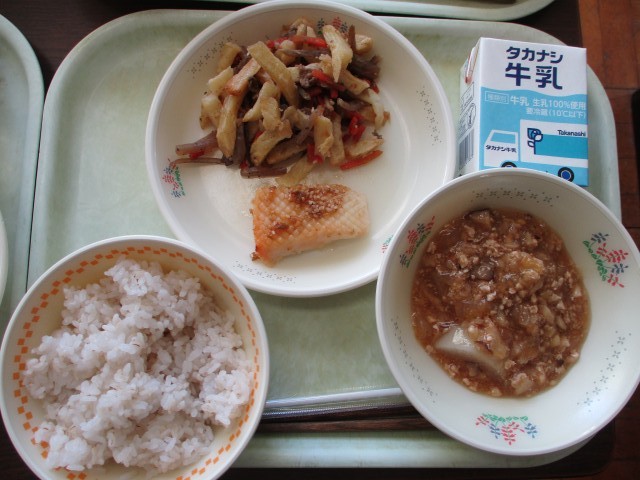今日の給食は、「いかのピリ辛ソース」「ばれいきんぴら」「ふろふき大根のそぼろあんかけ」です。