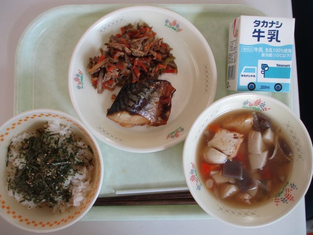 きょうの給食は、「魚の生姜風味焼」「五目きんぴら」「のっぺい汁」「麦入りご飯・青海苔ふりかけ」です。