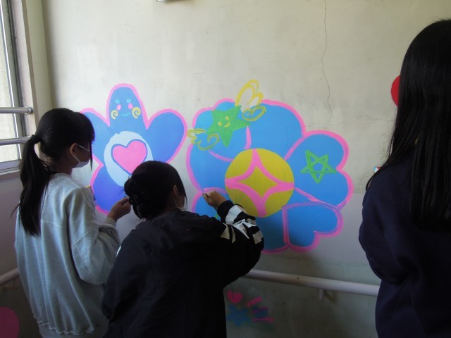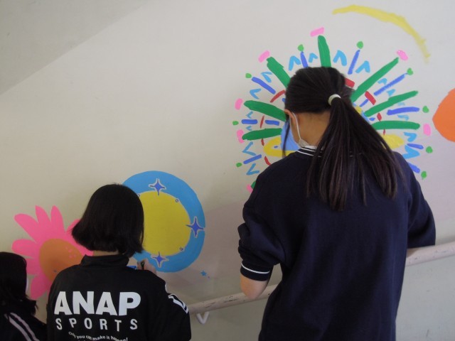 先週より「壁画(思い出)プロジェクト第二弾」が始まりました。2学期に描いた「円(まる)」に一人ひとりがお花を描いていきます。スタートは6年生です。「赤階段」にカラフルなお花が咲きました!!!