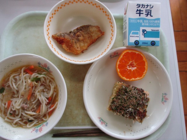 おいしい給食! 公開日 2026/01/21 更新日 2026/01/21 校長室より きょうの給食は、「みそラーメン」「さかなのさらさ揚げ」「もち入お好み焼き」「きっかみかん」です。「みそラーメン」のスープは、豚骨・鶏ガラ・こんぶ・鰹節をコトコト煮込んで作っています。 校長室より 全学年