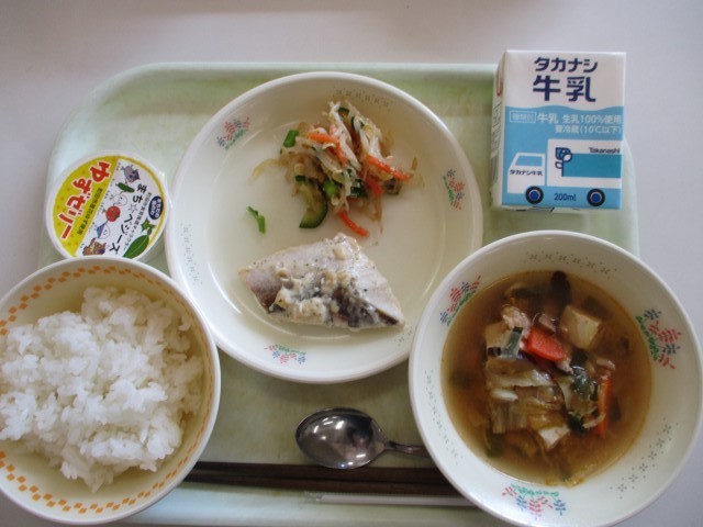 全国学校給食週間3日目の本日は、「東京都の明日葉と糸寒天いり野菜のあえもの」「町田の白菜キムチスープ」「町田の花柚子ゼリー」「さかなの味噌マヨ焼き」です。