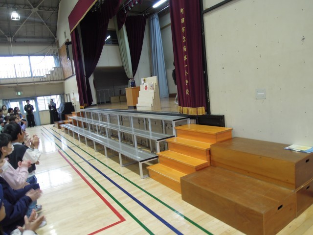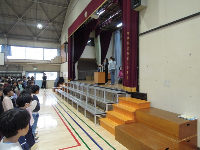 本日、今年度最後となる全校朝会を行いました。校長先生の「桃の花」の話に続いて表彰が行われました。「年間読書100冊」を達成した児童3名に大きな拍手が送られました。また、図書室に新しく仲間入りした「手作りの本棚」の紹介も行いました。これは用務主事さんが、子供たちがより本に親しめるようにと心を込めて製作してくださったものです。温かみのある新しい本棚を、これからみんなで大切に使っていきたいと思います。