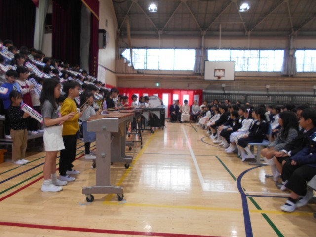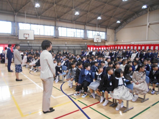 110名の新入生を迎えました。しっかりお話しが聞けて、返事も立派でした。2年生の歓迎の合唱と合奏も素敵でした。