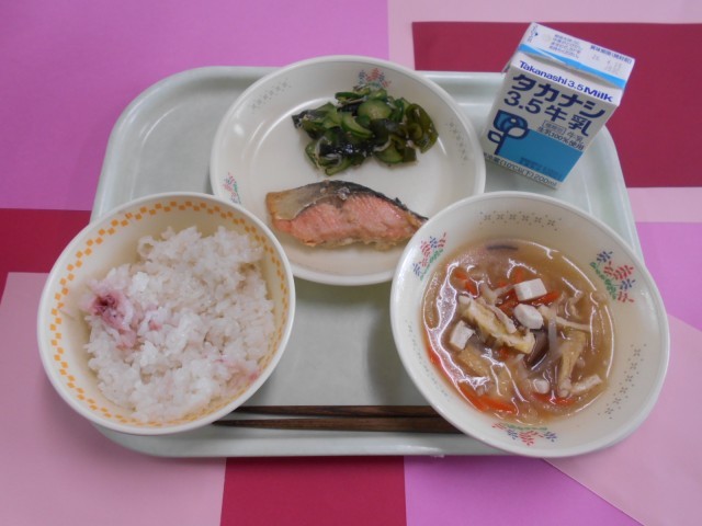 さくらおこわ 魚の塩こうじ焼き きゅうりの酢の物 沢煮わん