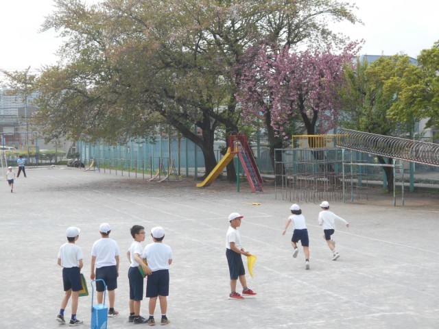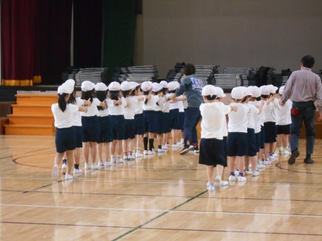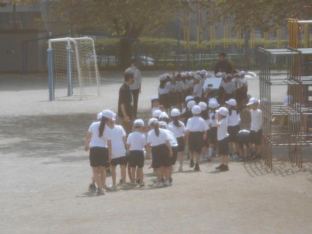 1年生だけでなく、どの学年・クラスでも、はじめに並び方は確認します。高学年はさすがに上手です。これができれば、走ったり、チームを分けたり、ボールを使ってゲームをしたりできるようになるわけですね。