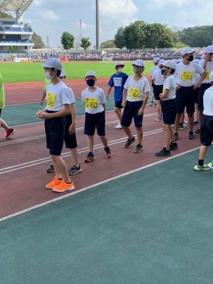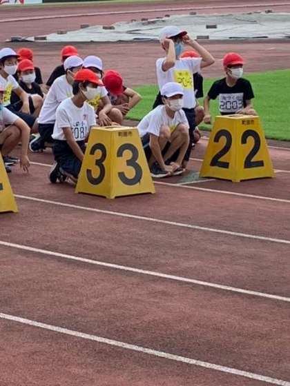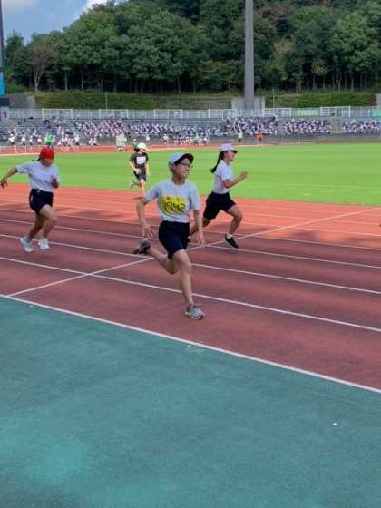 競技が進んでいます。左から50mハードルのスタートを待つ子供たち。真ん中は、走り幅跳び。右は、100m走です。